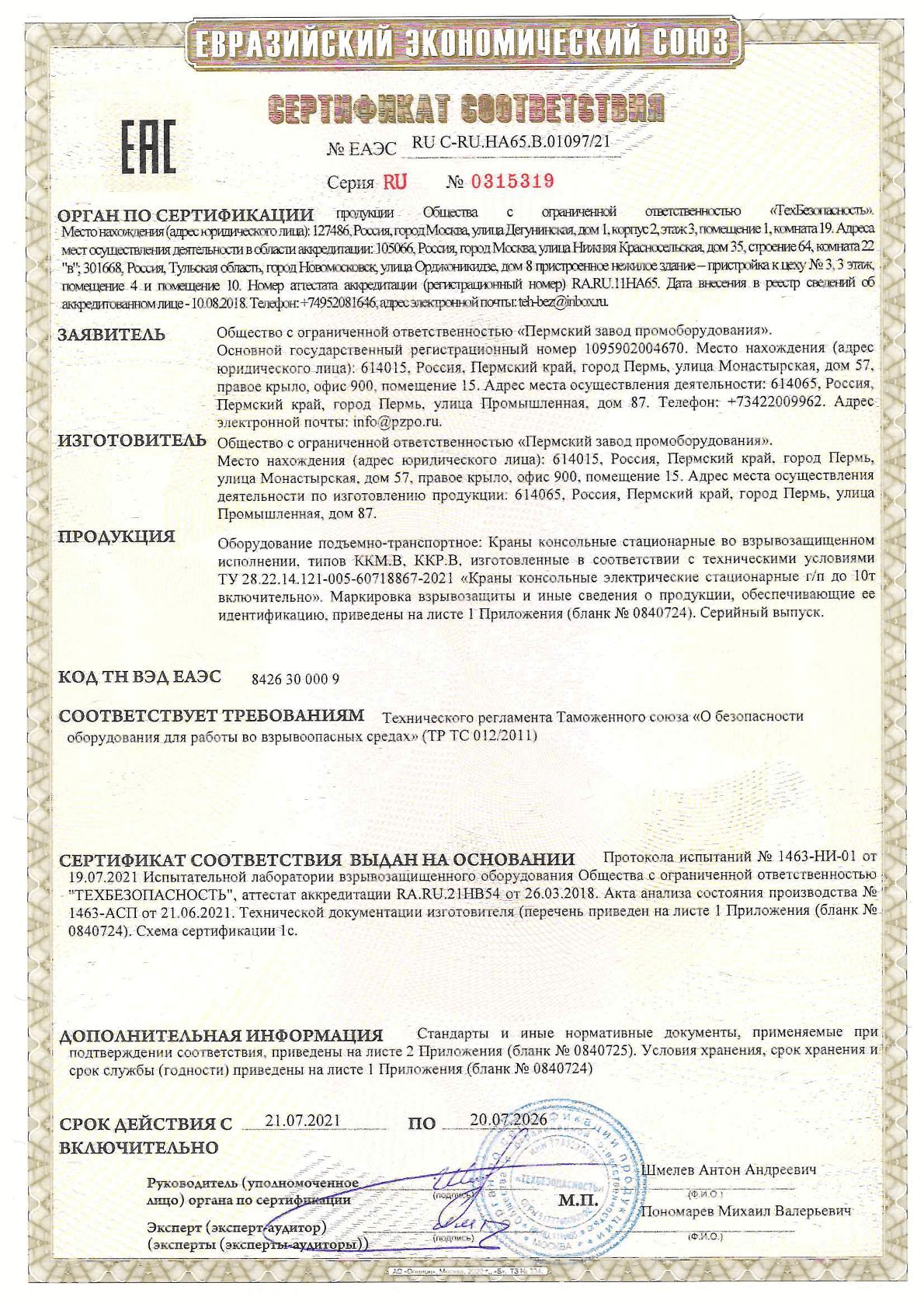 Сертификат ТР ТС Краны консольные электрические передвижные 10 тонн