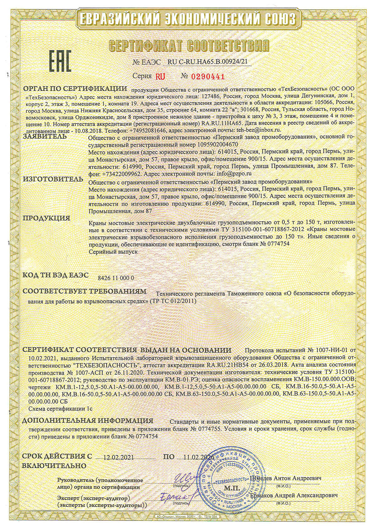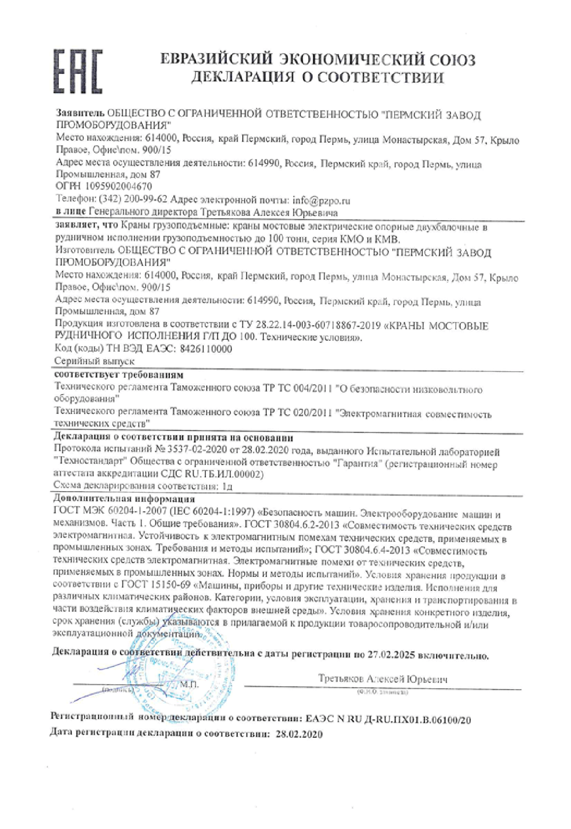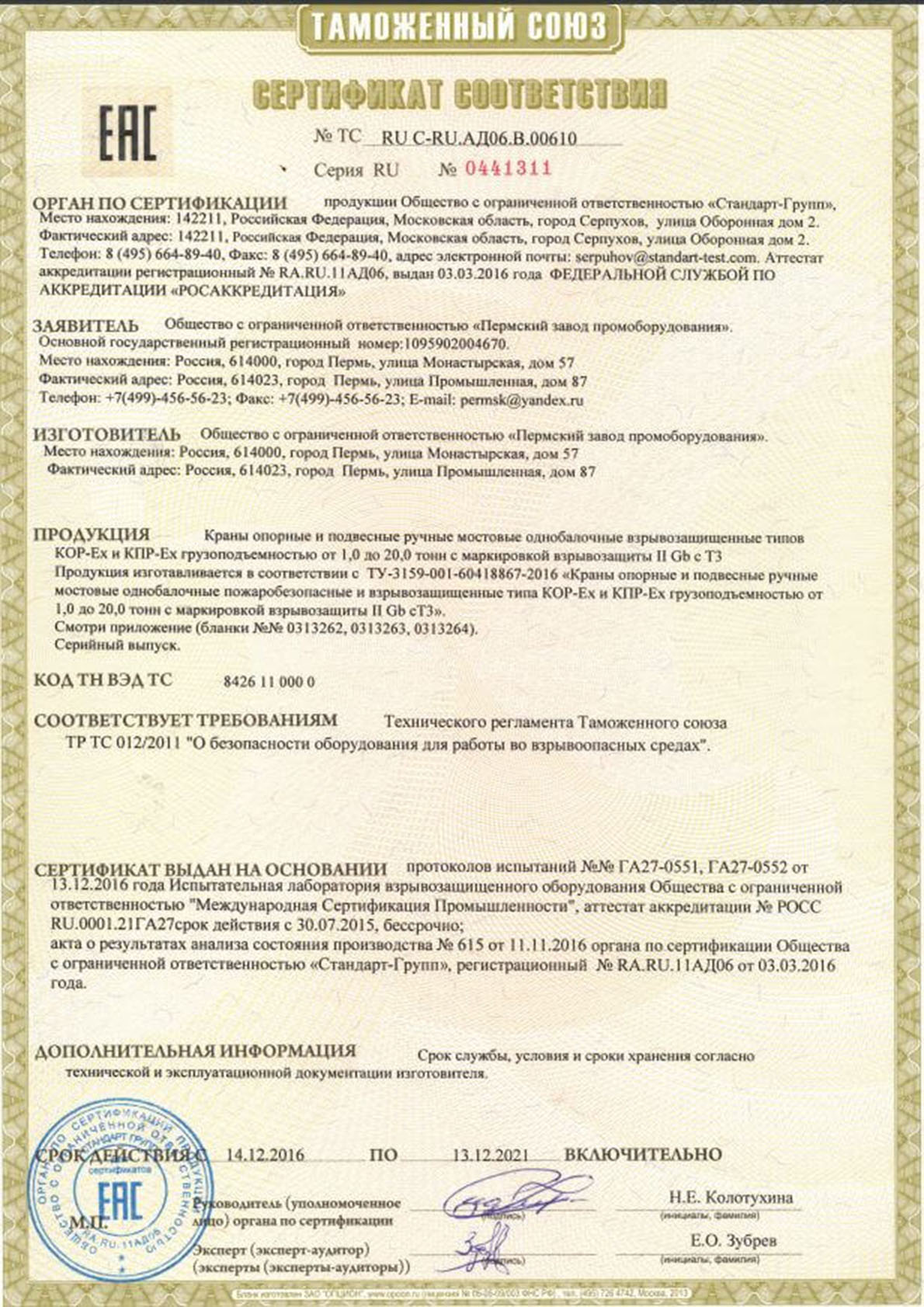 Сертификат ТР ТС - Козловые и полукозловые ручные до 20 тонн