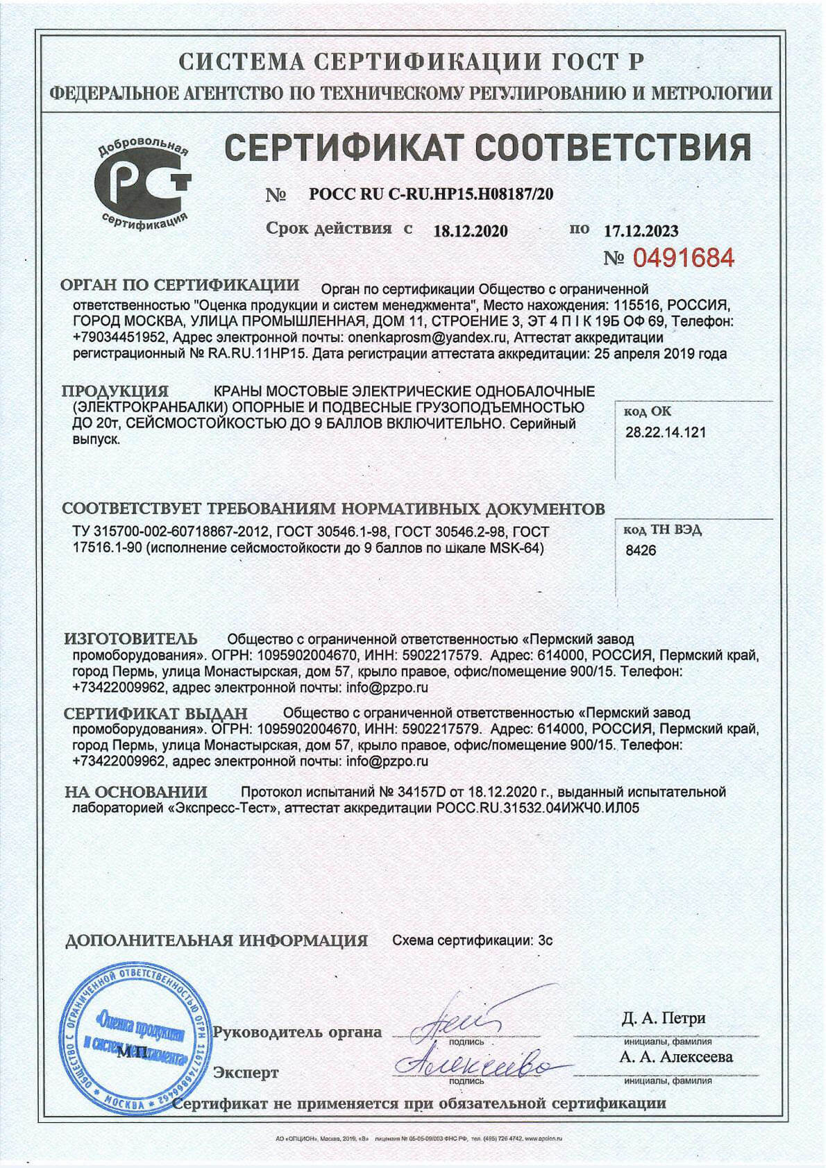 Сертификат сейсмичность 9 баллов однобалочники до 20т