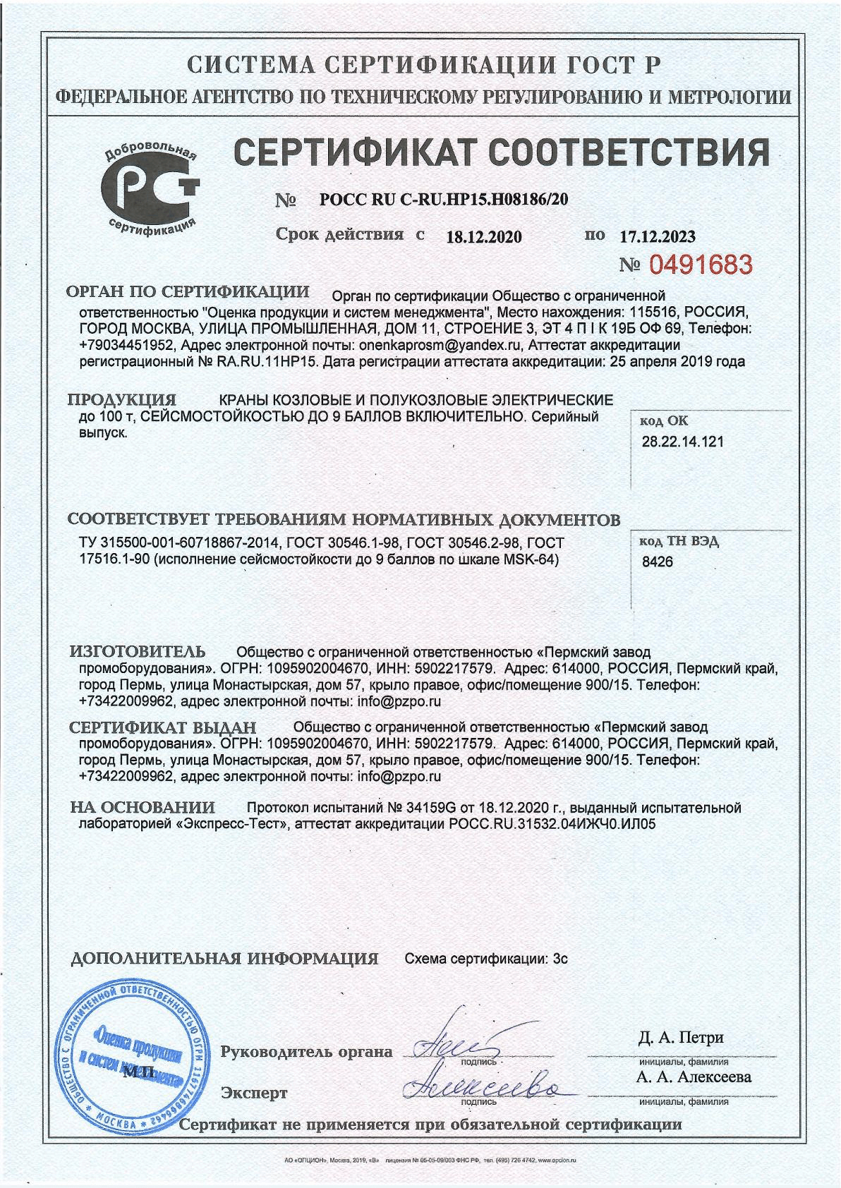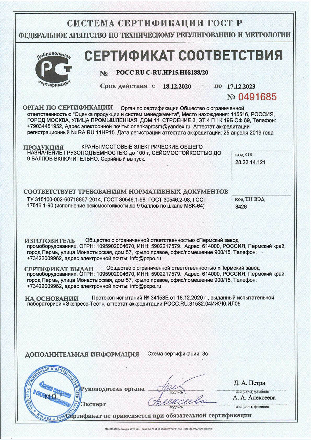 Сертификат сейсмичность 9 баллов козловые и полукозловые до 100т